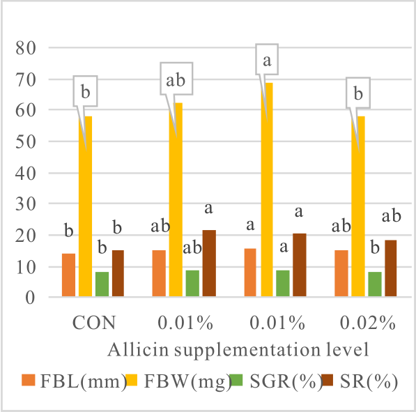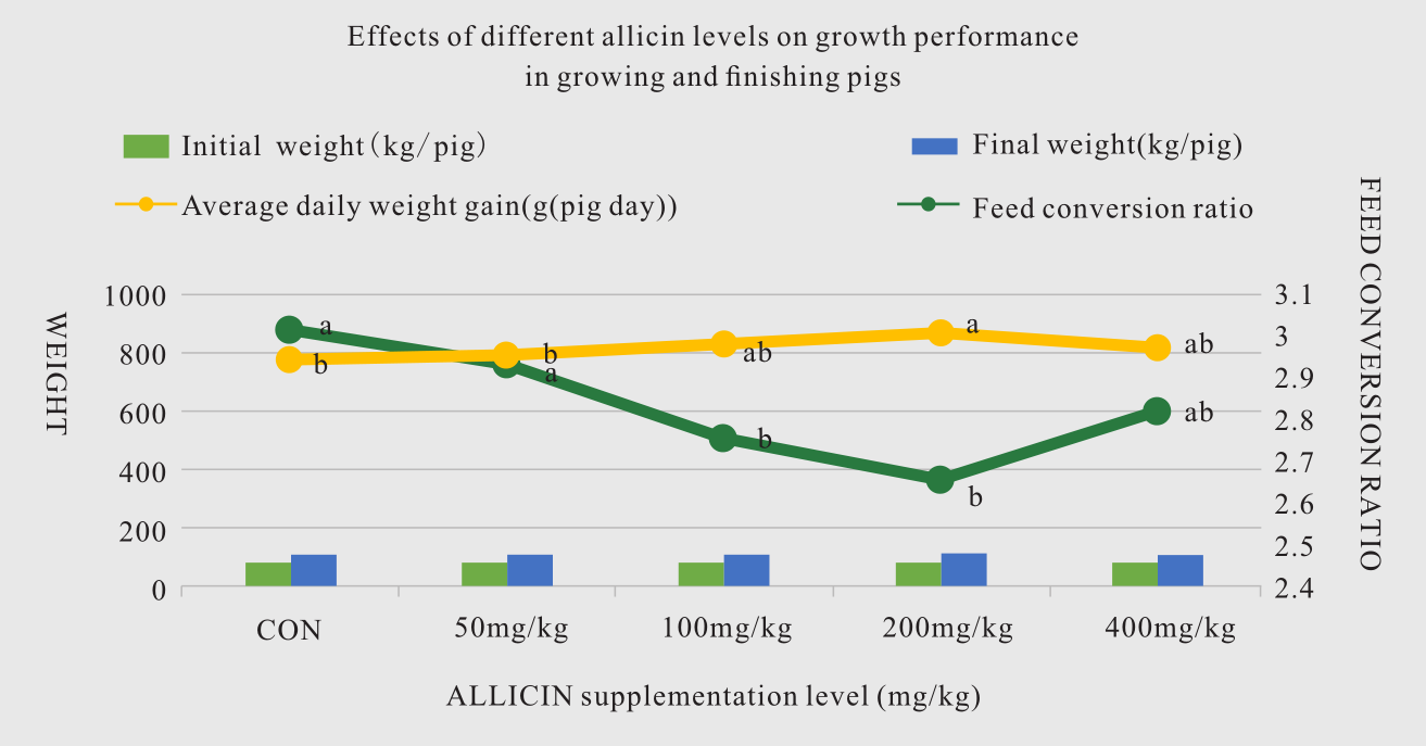 På grunn av sine utmerkede antibakterielle egenskaper er allicin mye brukt i fjørfe- og dyreforedling. Studier viser at det å tilsette allicin i fjørfedietter har betydelige fordeler når det gjelder å forbedre vekstytelse og immunitet. (* representerer en signifikant forskjell sammenlignet med kontrollgruppen; * * representerer en svært signifikant forskjell sammenlignet med kontrollgruppen, samme nedenfor)